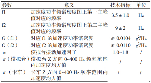 模擬運(yùn)輸臺的設(shè)計參數(shù)主要依據(jù)《QJ/T 815.2-94產(chǎn)品公路運(yùn)輸加速模擬試驗方法》[3]設(shè)定。該標(biāo)準(zhǔn)中規(guī)定了模擬運(yùn)輸臺的關(guān)鍵技術(shù)指標(biāo),見表1。