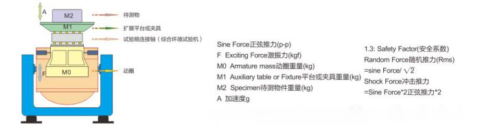 由于三軸電磁振動(dòng)臺(tái)的主參數(shù)是以激振力大小命名與排序的,根據(jù)已知的參數(shù),利用∑ m x a= ( m1 + m2 + m3 + m4) x a計(jì)算出激振力的大小,并加1.3安全系數(shù),便能確定在加速度區(qū)域所需的激振力的大小,并以此作為選定相應(yīng)型號(hào)的依據(jù)。