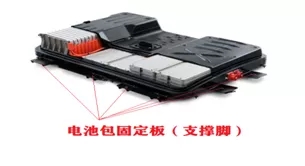 動力電池振動能量傳播的第一切入點是電池包的固定板,在作螺釘固定時有必要模擬裝車的實況,固定板在電池包殼體的布置狀況見圖3電池包的支撐腳。